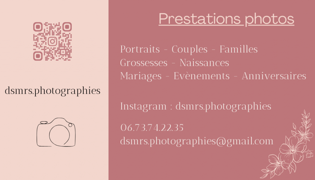 Je vous propose plusieurs prestations en tant que photographe afin de m’adapter au mieux à vos attentes !